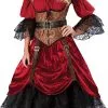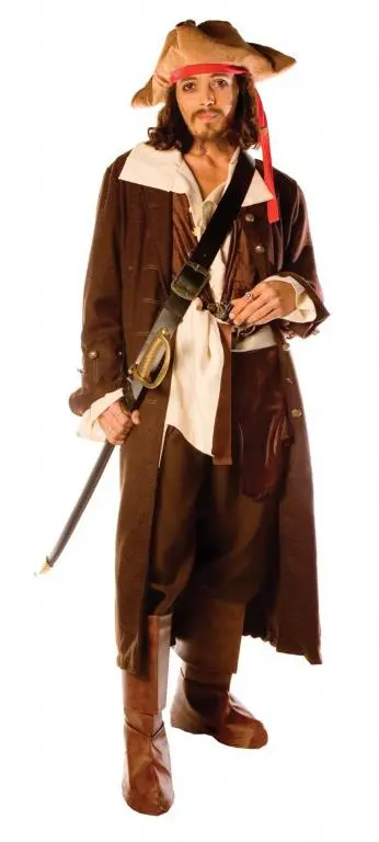 Captain Jack includes: heavy wool detailed coat, vest with attached shirt, pants, faux leather boot tops, belt, waist sash, sword shoulder belt, faux suede pirate hat.