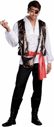 This rough raider’s costume includes: A long sleeve lace-up neckline shirt with attached faux vinyl snap front vest, waist tie, bag, removable “Captain One-Eyed Willy” name badge and an eye patch.