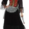 Costume Includes: Sassy white bodice style dress with black and red sleevettes, boot covers, collar and skull head scarf.