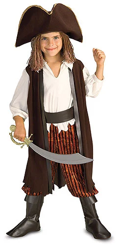 Jumpsuit w/attached Vest & Boot TopsHat w/Yarn HairBeltThis charming Caribbean Pirate Costume is sure to attract some compliments from the smiling onlookers. The polyester shirt on the top of the jumpsuit has a brown vest and vinyl belt attached to it. An elastic waistband where the shirt and pants meet (and are sewn together) adds to the comfort of this adorable costume. The orange and black striped pants have a velvet look and feel to them. Vinyl boot tops and an intricate pirate hat with yarn hair top off this one-of-a-kind costume!