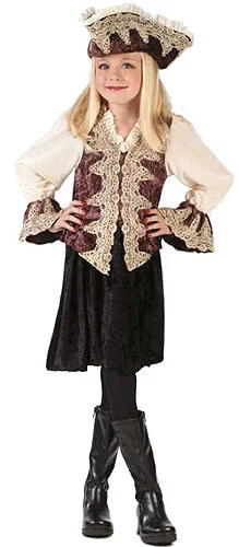 Girl’s Crushed Velvet DressChild Pirate HatThis Girl’s Pirate Costume will prepare your child for the seven seas! The dress has long ivory colored sleeves and a velvet middle section. On the top of the dress, there is an intricate design of a gold and ivory colored floral pattern. The velvet cuffs are also decorated with this design. There is an elastic band at the back of the waist for a more comfortable fit. Finally, a brown velvet hat with white ruffled trim adds some more classiness to this adorable costume. Just add a pair of our black pirate boots to finish off the look!
