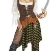 Explore The High SeasCostume Includes: Peasant sleeve pirate shirt with attached faux leather vest, striped skirt, belt, pirate bandana, distressed leather-look boot tops and matching pirate hat. Pair with the High Seas Pirate for the perfect pirate couples… the his & hers match! Available sizes: