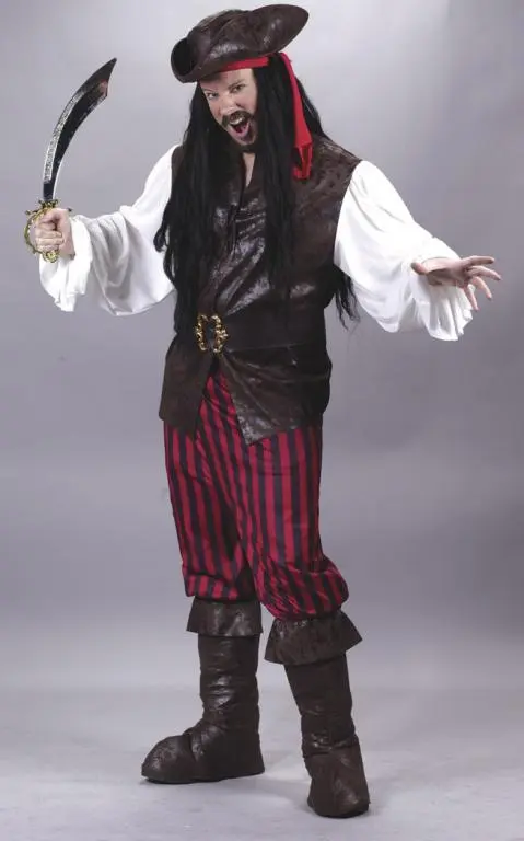 Come Sail The Seas With MeCosutme Includes: Peasant sleeve pirate shirt with attached vest, striped pants, belt, pirate bandana, distressed leather-look boot tops and matching pirate hat. Available size: