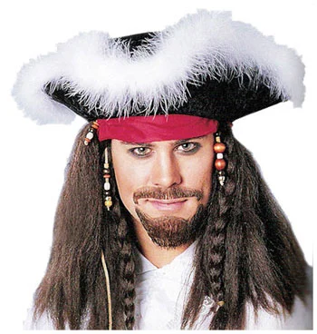 Velveteen Hat w/White Feather TrimThis black velvet three corner hat will give you the stylish pirate look you’ve been wanting. It has shiny velvet as well as white fur on the top The inside circumference is about 24″ and it’s already formed into the traditional pirates style.