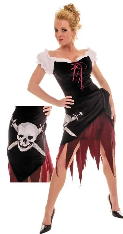It’s An Act To Steal Your TreasureCostume Includes: Sexy, off shoulder style lace-up bodice, shredded bottom dress with pirate skull hip scarf. Available sizes: